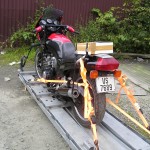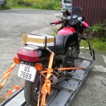 Jeg fikk god hjelp av Tore som jobber på Yamaha senteret med å stroppe motorsykkelen på transport plata, dette var gjort på 20 minutter. Etterpå tappet jeg tanken for bensin og koblet fra batteriet – speiler ble også demontert